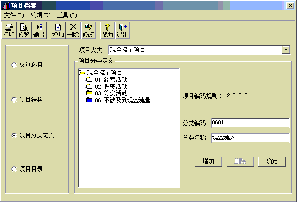 三、 項(xiàng)目分定義:因?yàn)橛糜沿?cái)務(wù)軟件的特殊性,在項(xiàng)目分錄定義中,需要增加類(lèi)似圖中06、0601、0602的三個(gè)分類(lèi)